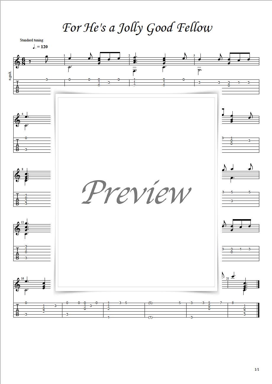For He's a Jolly Good Fellow guitar tab pdf free. An accurate, beginner-friendly fingerstyle version of For He's a Jolly Good Fellow was arranged for solo guitar includes sheet music. No capo and standard tuning. Suitable for beginner guitar players.